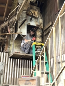The existing furnace was mounted on a platform approximately 10 feet above ground level, positioned directly above a stairway in the industrial facility. This wasn’t a simple basement replacement or ground-level swap—every piece of equipment had to be safely maneuvered up and down using ladders while working on an elevated platform.